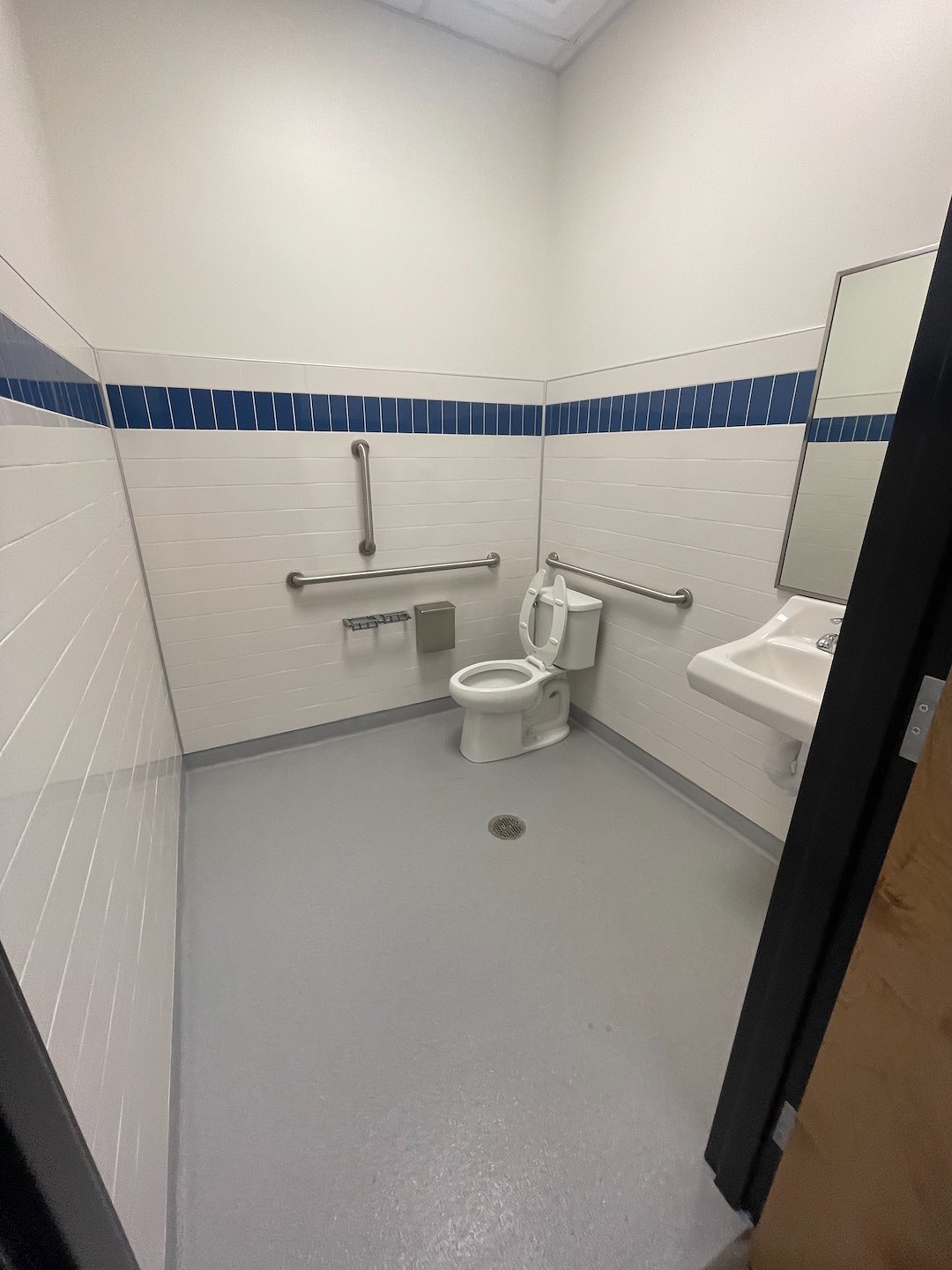 The restrooms were cleaned and sanitized following a clear, consistent routine. Fixtures including sinks, toilets, and counters were cleaned, disinfected, and wiped dry. Mirrors and glass surfaces were cleaned to remove spots and streaks. Floors and wall surfaces in the restroom were scrubbed and rinsed, and trash receptacles were emptied and relined. We paid special attention to contact points such as door handles and dispenser surfaces to reduce shared-surface contamination.